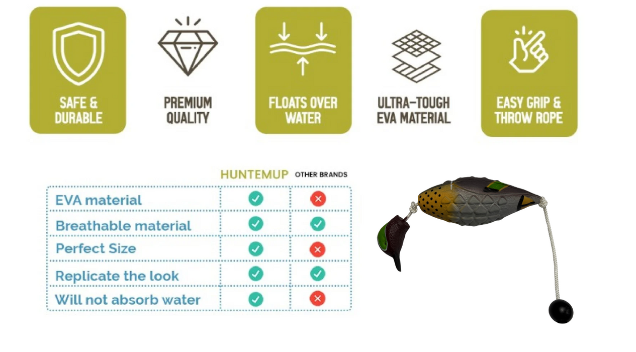 Made from durable, puncture-proof PVC material, the HuntEmUp Ultimate Greenwing Teal is built to withstand rough handling and repeated retrieves. Its rugged construction guarantees long-term durability, even in demanding training sessions.